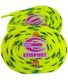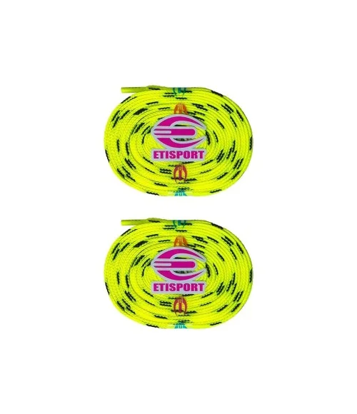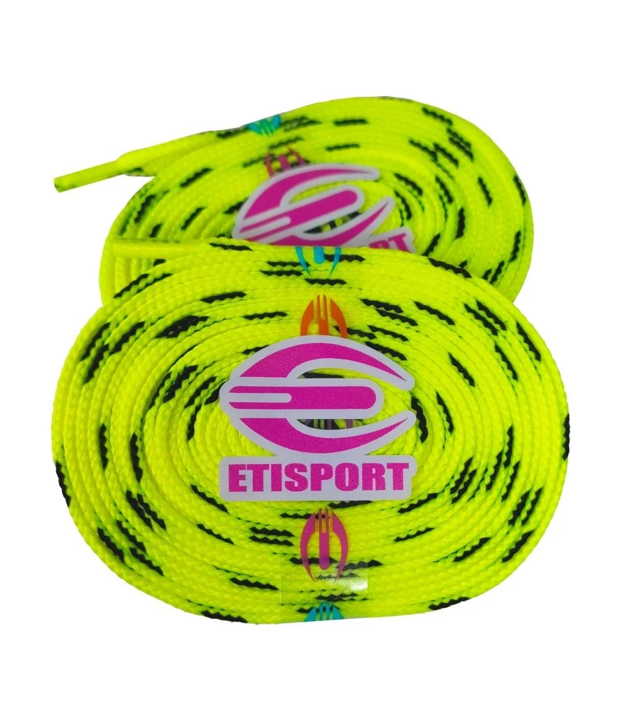 Els cordons Etisport per a Hoquei Patins groc fluor amb pintes negres (3 m) combinen disseny i funcionalitat per a respondre a les exigències de l'esport professional. La seva estructura plana facilita un ajust còmode i segur, permetent embolicar completament el peu gràcies a la seva longitud de 3 metres (118 in). Fabricats amb fibres d'alta resistència, ofereixen una durabilitat superior enfront del desgast habitual.