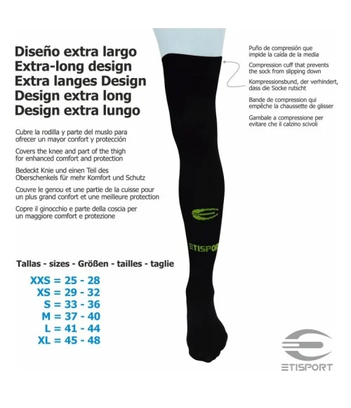Pensades per a esportistes d’alt nivell, les mitges Etisport en color groc fluor i negre de hoquei patins destaquen per la seva estructura sense costures, el teixit tècnic en zones estratègiques i el seu disseny extra llarg, ideal per cobrir el genoll i part del muscle.