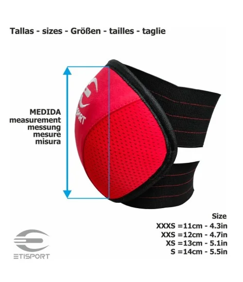 El Kit 3pcs Etisport Iniciación (guantes, rodilleras y espinillera) Negro - Talla XXXS incluye espinilleras, rodilleras y guantes disponibles en azul, rojo o negro, y en las tallas XXXS, XXS, XS y S.