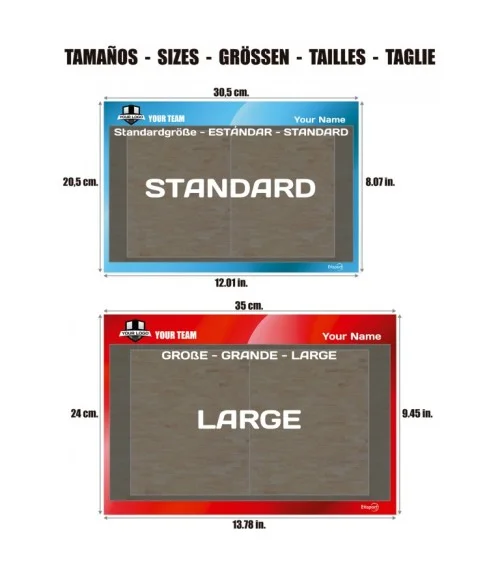 • Doble cara: una cara con plano completo (Large / Standard) y reverso con medio campo o espacio de notas.